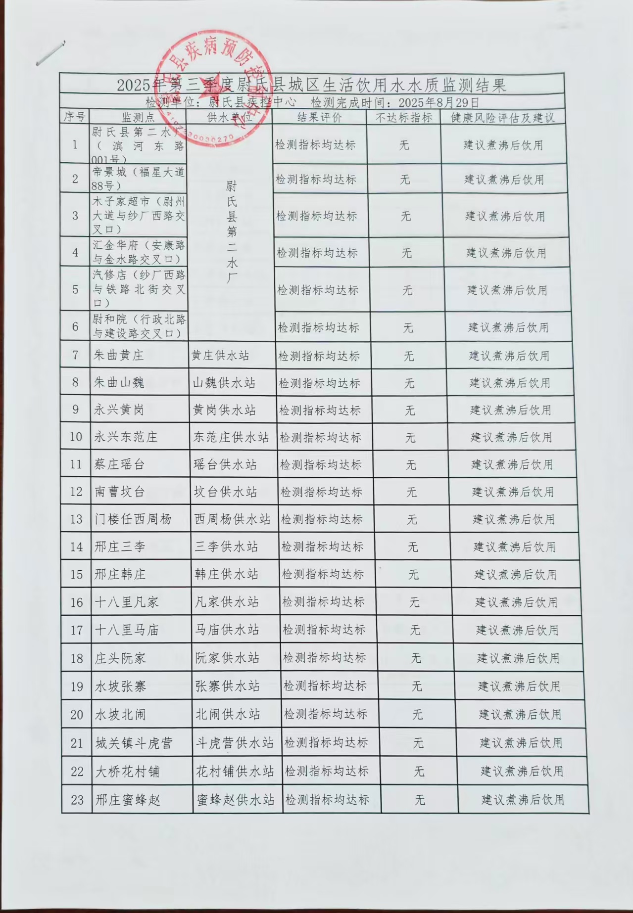 2025年第三季度尉氏县城区生活饮用水水质监测结果