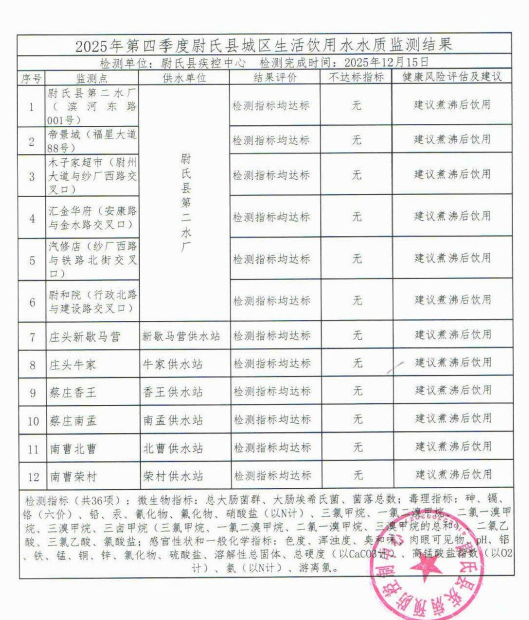 2025年第四季度尉氏县城区生活饮用水水质监测结果