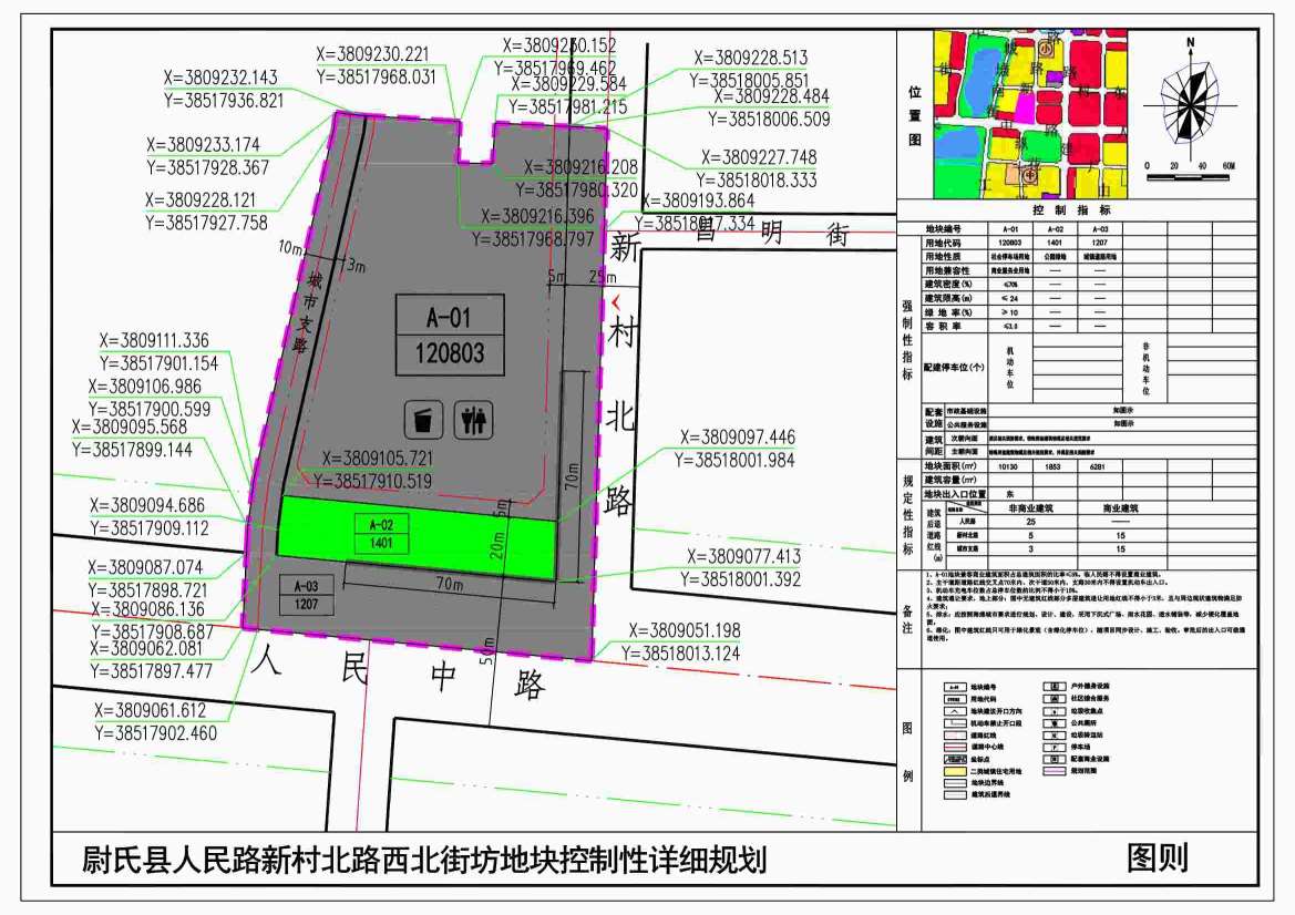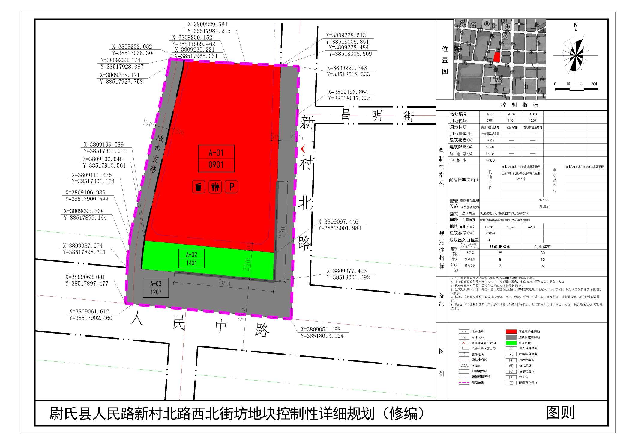 尉氏县人民路新村北路西北街坊位于尉氏县人民路与新村北路交叉口西北。原用地性质社会停车场用地兼容商业服务业用地,为了保证整个地块的规整性,现拟修编A-01号地块用地性质为商业服务业用地兼容社会停车场用地,详见附图“尉氏县人民路新村北路西北街坊地块控制性详细规划(图则)、”“尉氏县人民路新村北路西北街坊地块控制性详细规划(修编)”。