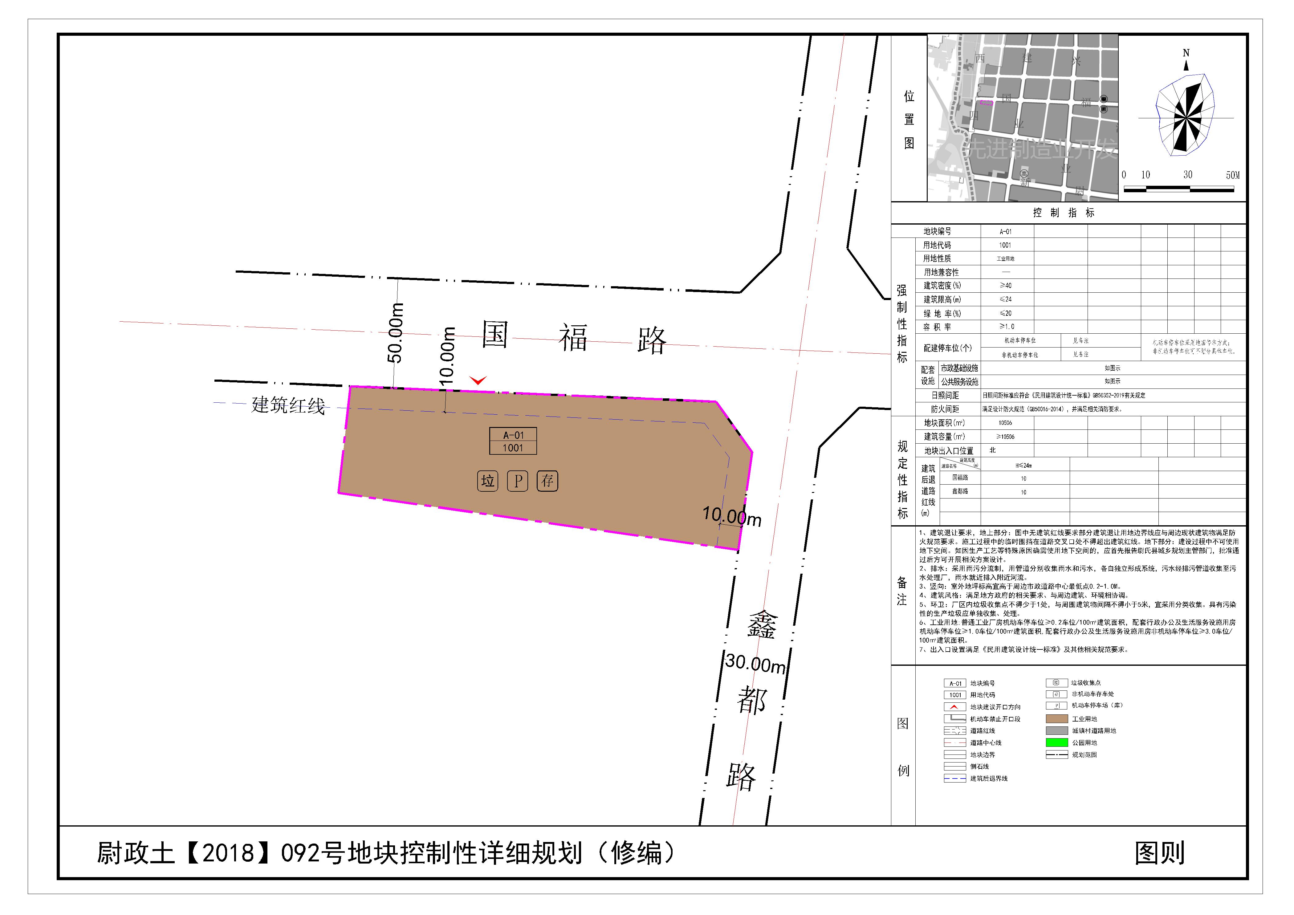 尉政土【2018】092号地块位于尉氏县国福路与鑫都路交叉口西南,规划范围内用地性质为工业用地。详见附图“尉政土【2018】092号地块控制性详细规划(修编)(图则)”。
