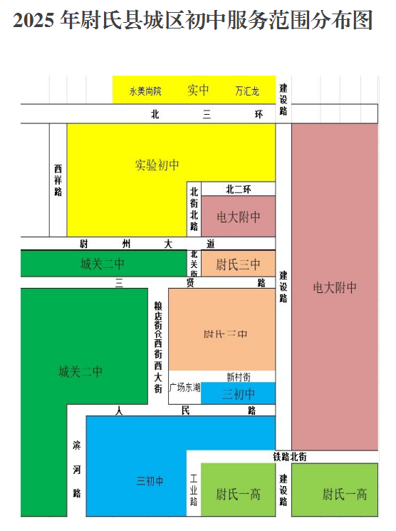 5、尉氏三高初中部:居住在建设路以西,尉州大道以南,北关街粮店街仓西街西大街以东,人民路以北、新村街以北区域。